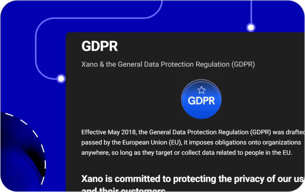 With Xano ensures that your data is hosted in full compliance with GDPR regulations, with the option to choose hosting within the European Union. This guarantees that your sensitive user data remains within EU borders, adhering to strict privacy and data protection laws, providing peace of mind for both you and your users.